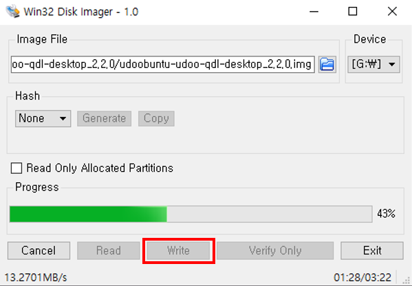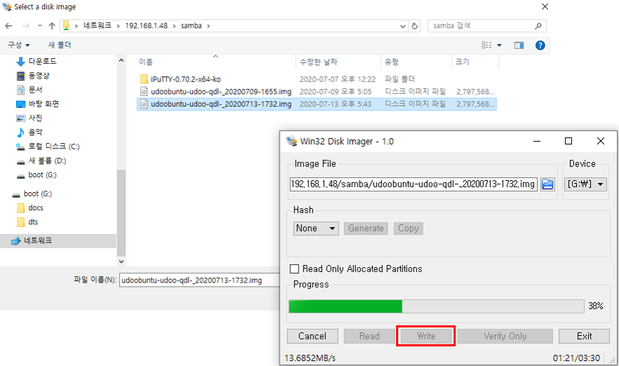 6. Ubuntu 설정 & win32diskimager 실행 후 압축 푼 이미지와 디바이스 선택후 Write(초기화)