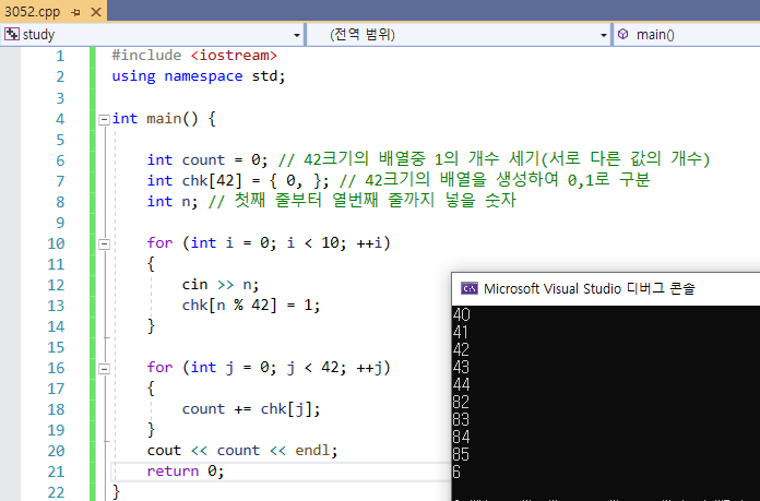 2. 나머지를 체크할 bool배열을 만들어서 true개수를 구하는 방법도 있음.