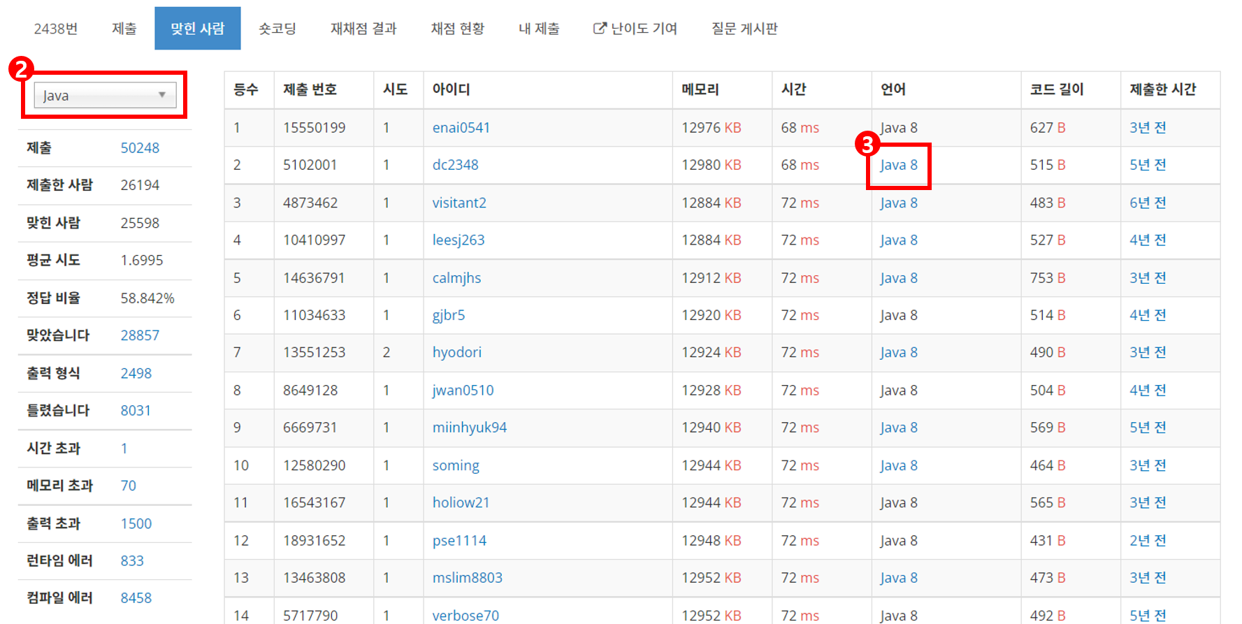 풀고자 하는 문제의 다른 사람(맞힌 사람) 코드 보는 방법은 다음과 같다. 예) 2438번 문제